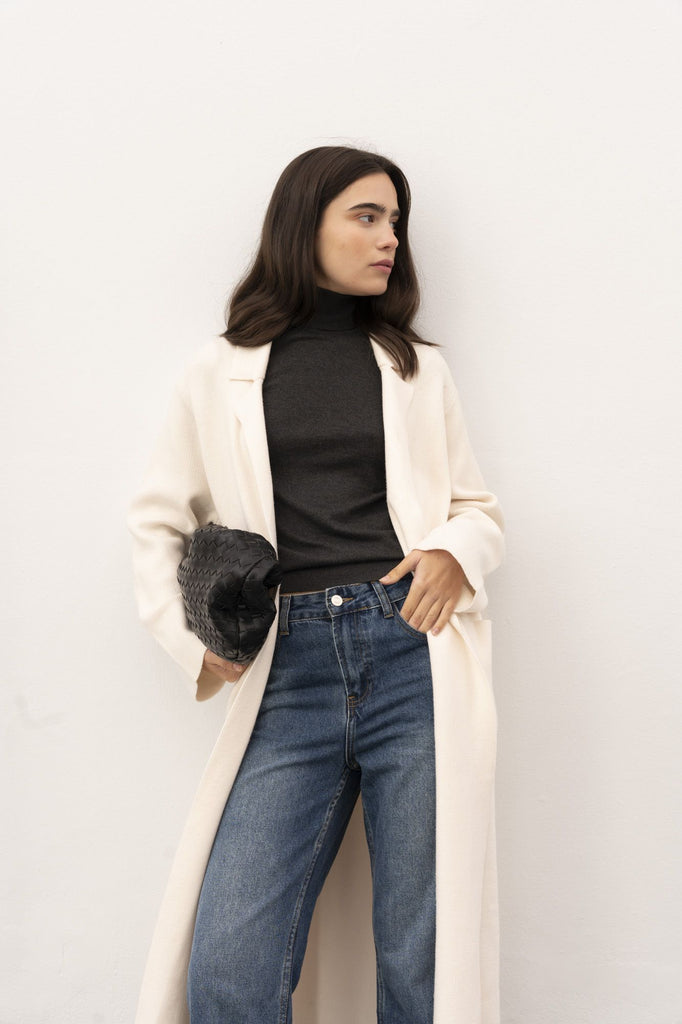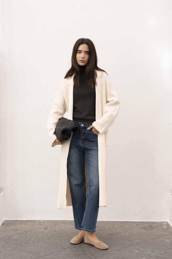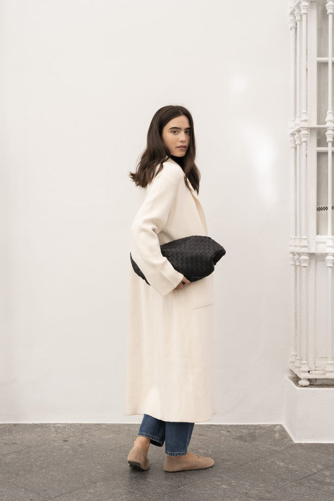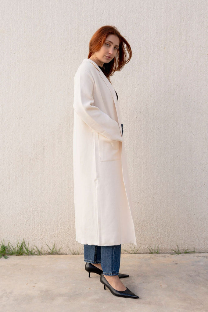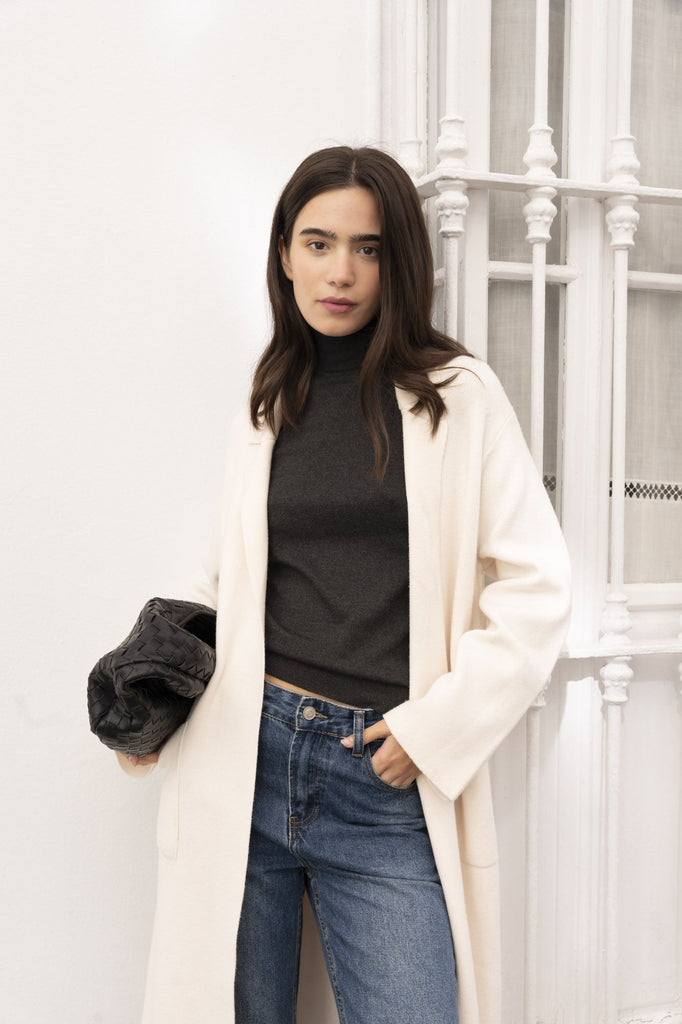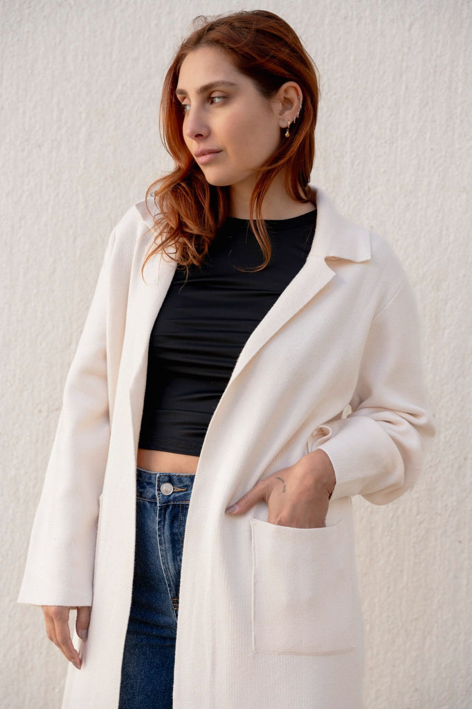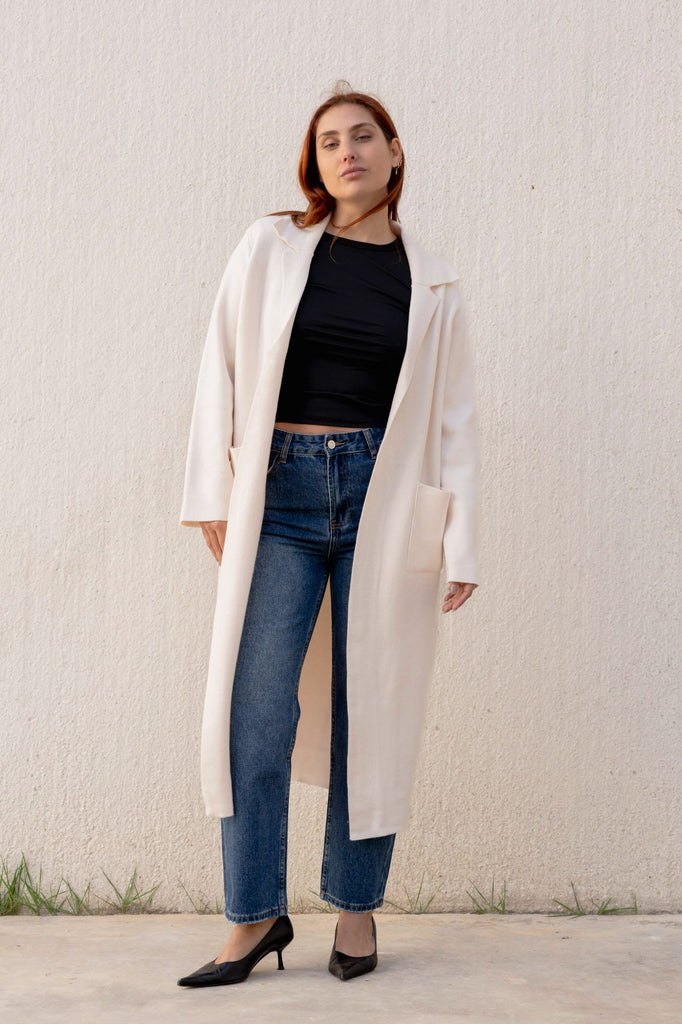 Abrigo oversize largo de punto liso de color beige. Ideal para sentirte abrigada y cómoda al mismo tiempo.