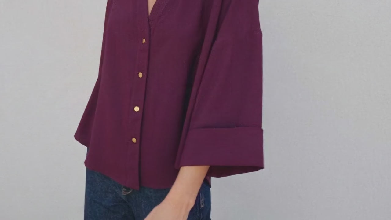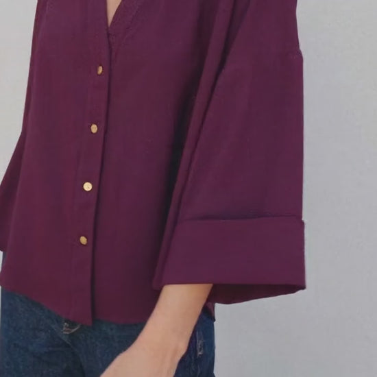 Camisa de cuello solapa y escote pico. Manga por debajo del codo acabado en vuelta. Bajo asimétrico. Cierre frontal con botones a contraste.